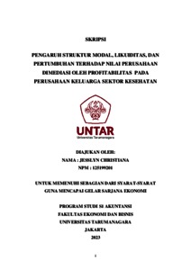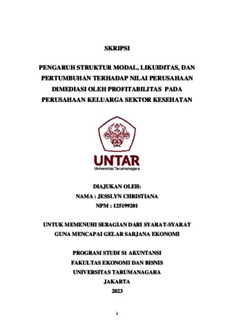 CHRISTIANA, JESSLYN (2023) PENGARUH STRUKTUR MODAL, LIKUIDITAS, DAN PERTUMBUHAN TERHADAP NILAI PERUSAHAAN DIMEDIASI OLEH PROFITABILITAS PADA PERUSAHAAN KELUARGA SEKTOR KESEHATAN. Skripsi thesis, Universitas Tarumanagara.