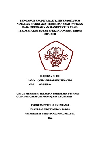 Lieyanto, Johannes Alvin (2022) PENGARUH PROFITABILITY, LEVERAGE, FIRM SIZE, DAN BOARD SIZE TERHADAP CASH HOLDING PADA PERUSAHAAN MANUFAKTUR YANG TERDAFTAR DI BURSA EFEK INDONESIA TAHUN 2017-2020. Skripsi thesis, Universitas Tarumanagara.