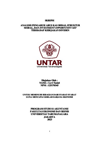 Taniel, Levi (2023) ANALISIS PENGARUH ARUS KAS BEBAS, STRUKTUR MODAL, DAN INVESTMENT OPPORTUNITY SET TERHADAP KEBIJAKAN DIVIDEN. Skripsi thesis, Universitas Tarumanagara.
