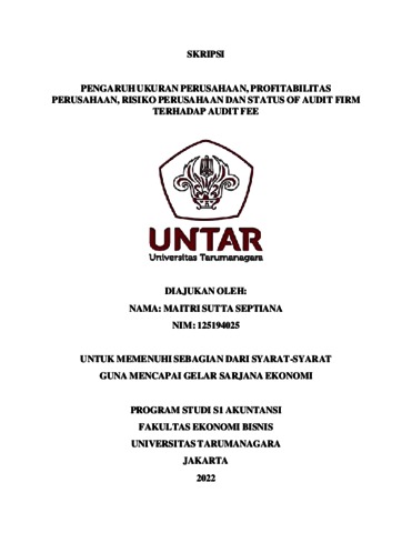 SEPTIANA, MAITRI SUTTA (2022) PENGARUH UKURAN PERUSAHAAN, PROFITABILITAS PERUSAHAAN, RISIKO PERUSAHAAN DAN STATUS OF AUDIT FIRM TERHADAP AUDIT FEE. Skripsi thesis, Universitas Tarumanagara.