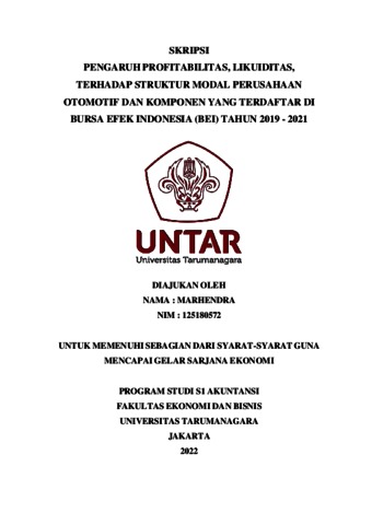 MARHENDRA, MARHENDRA (2022) PENGARUH PROFITABILITAS, LIKUIDITAS, TERHADAP STRUKTUR MODAL PERUSAHAAN OTOMOTIF DAN KOMPONEN YANG TERDAFTAR DI BURSA EFEK INDONESIA (BEI) TAHUN 2019 - 2021. Skripsi thesis, Universitas Tarumanagara.