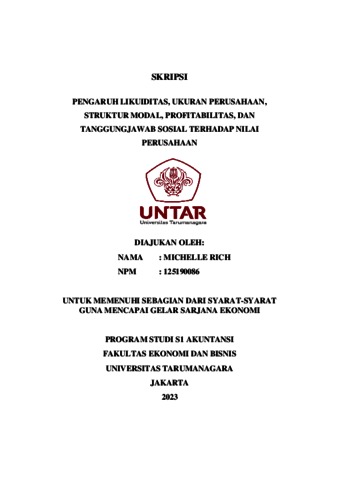 RICH, MICHELLE (2023) PENGARUH LIKUIDITAS, UKURAN PERUSAHAAN, STRUKTUR MODAL, PROFITABILITAS, DAN TANGGUNGJAWAB SOSIAL TERHADAP NILAI PERUSAHAAN. Skripsi thesis, Universitas Tarumanagara.