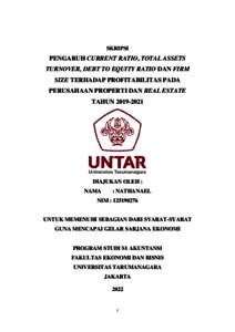 NATHANAEL, NATHANAEL (2022) PENGARUH CURRENT RATIO, TOTAL ASSETS TURNOVER, DEBT TO EQUITY RATIO DAN FIRM SIZE TERHADAP PROFITABILITAS PADA PERUSAHAAN PROPERTI DAN REAL ESTATE TAHUN 2019-2021. Skripsi thesis, Universitas Tarumanagara.
