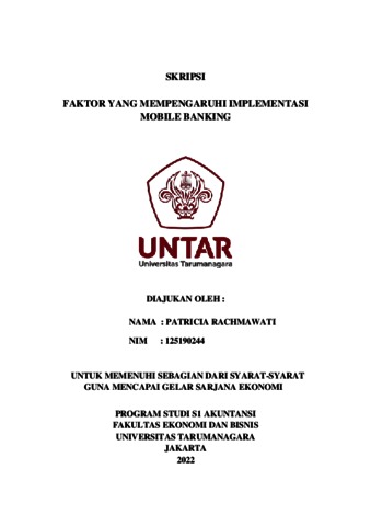 RACHMAWATI, PATRICIA (2022) FAKTOR YANG MEMPENGARUHI IMPLEMENTASI MOBILE BANKING. Skripsi thesis, Universitas Tarumanagara.