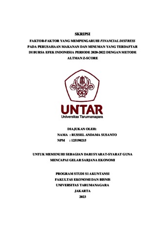 SUSANTO, RUSSEL ANDAMA (2023) FAKTOR-FAKTOR YANG MEMPENGARUHI FINANCIAL DISTRESS PADA PERUSAHAAN MAKANAN DAN MINUMAN YANG TERDAFTAR DI BURSA EFEK INDONESIA PERIODE 2020-2022 DENGAN METODE ALTMAN Z-SCORE. Skripsi thesis, Universitas Tarumanagara.