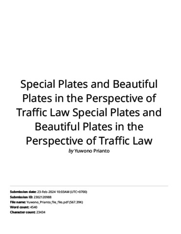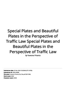 Prianto, Yuwono and Nadya, Faradiba JSM and Alexander, Cevin Christian Turnitin: Special Plates and Beautiful Plates in the Perspective of Traffic Law Special Plates and Beautiful Plates in the Perspective of Traffic Law. International Journal of Enginering Business and SocialScience.