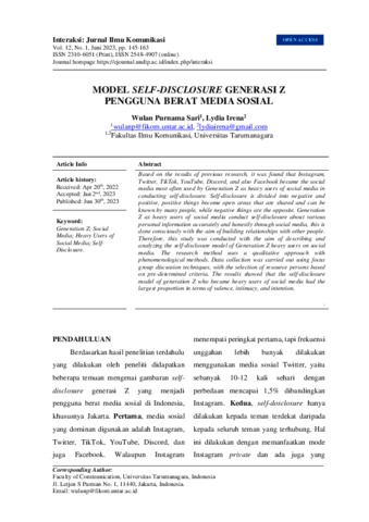 Wulan Purnama Sari, Pertama and Lydia Irena, Kedua MODEL SELF-DISCLOSURE GENERASI Z PENGGUNA BERAT MEDIA SOSIAL. MODEL SELF-DISCLOSURE GENERASI Z PENGGUNA BERAT MEDIA SOSIAL. ISSN ISSN 2310-6051 (Print), ISSN 2548-4907 (online)
