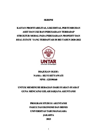 SETYAWATI, SILVI (2023) KAITAN PROFITABILITAS, LIKUIDITAS, PERTUMBUHAN ASET DAN UKURAN PERUSAHAAN TERHADAP STRUKTUR MODAL PADA PERUSAHAAN PROPERTY DAN REAL ESTATE YANG TERDAFTAR DI BEI TAHUN 2020-2022. Skripsi thesis, Universitas Tarumanagara.