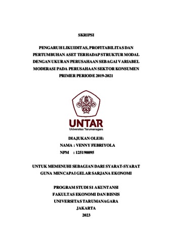 FEBRIYOLA, VENNY (2023) PENGARUH LIKUIDITAS, PROFITABILITAS DAN PERTUMBUHAN ASET TERHADAP STRUKTUR MODAL DENGAN UKURAN PERUSAHAAN SEBAGAI VARIABEL MODERASI PADA PERUSAHAAN SEKTOR KONSUMEN PRIMER PERIODE 2019-2021. Skripsi thesis, Universitas Tarumanagara.
