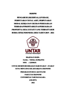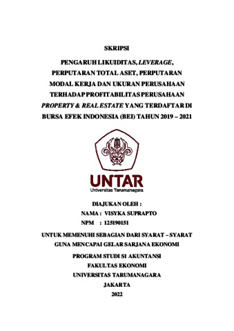 SUPRAPTO, VISYKA (2022) PENGARUH LIKUIDITAS, LEVERAGE, PERPUTARAN TOTAL ASET, PERPUTARAN MODAL KERJA DAN UKURAN PERUSAHAAN TERHADAP PROFITABILITAS PERUSAHAAN PROPERTY & REAL ESTATE YANG TERDAFTAR DI BURSA EFEK INDONESIA (BEI) TAHUN 2019 – 2021. Skripsi thesis, Universitas Tarumanagara.