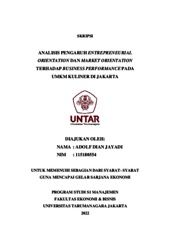 JAYADI, ADOLF DIAN (2022) ANALISIS PENGARUH ENTREPRENEURIAL ORIENTATION DAN MARKET ORIENTATION TERHADAP BUSINESS PERFORMANCE PADA UMKM KULINER DI JAKARTA. Skripsi thesis, Universitas Tarumanagara.
