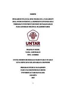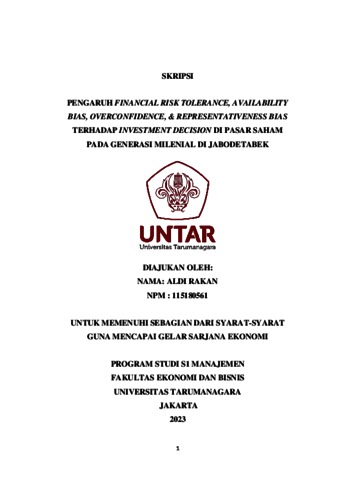 RAKAN, ALDI (2023) PENGARUH FINANCIAL RISK TOLERANCE, AVAILABILITY BIAS, OVERCONFIDENCE, & REPRESENTATIVENESS BIAS TERHADAP INVESTMENT DECISION DI PASAR SAHAM PADA GENERASI MILENIAL DI JABODETABEK. Skripsi thesis, Universitas Tarumanagara.