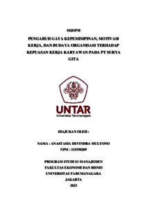 MULYONO, ANASTASIA DEVINDRA (2023) PENGARUH GAYA KEPEMIMPINAN, MOTIVASI KERJA, DAN BUDAYA ORGANISASI TERHADAP KEPUASAN KERJA KARYAWAN PADA PT SURYA GITA. Skripsi thesis, Universitas Tarumanagara.