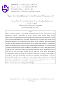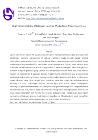 Prianto, Yuwono and Fahri, Achmad and Wiratno, Sndy and Budidrsono, Anya Sitara and Anggara, Josh Julian (2023) Urgensi Nasionalisme Dikalangan Generasi Muda dalam Menyongsong 4.0. INNOVATIVE: Journal Of Social Science Research, 3 (5). ISSN 2807-4238