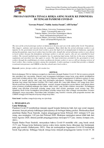 Prianto, Yuwono and Fuzain, Nabila Annisa and Farhan, Afif (2021) PRO DAN KONTRA TENAGA KERJA ASING MASUK KE INDONESIA DI TENGAH PANDEMI COVID-19. SENAPENMAS.