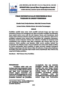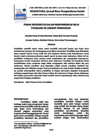 Yosal, Claudia and Hartono, Evelyn and Rafi, Faksi and Prianto, Yuwono (2023) PERAN UNIVERSITAS DALAM MENUMBUHKAN NILAI TOLERANSI DI LINGKUP PENDIDIKAN. NUSANTARA: Jurnal Ilmu Pengetahuan Sosial, 10 (9).