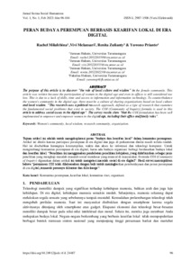 Milafebina, Rachel and Melansari, Vivi and Zulianty, Renita and Prianto, Yuwono (2023) PERAN BUDAYA PEREMPUAN BERBASIS KEARIFAN LOKAL DI ERA DIGITAL. Jurnal Serina Sosial Humaniora, 1 (1). ISSN 2987-1506