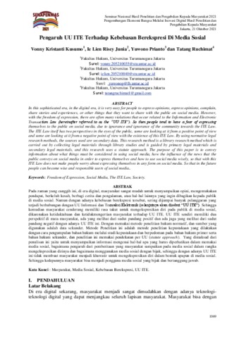Kusumo, Vonny Kristanti and Junia, Ie Lien Risey and Prianto, Yuwono and Ruchimat, Tatang (2021) Pengaruh UU ITE Terhadap Kebebasan Berekspresi Di Media Sosial. SENAPENMAS.