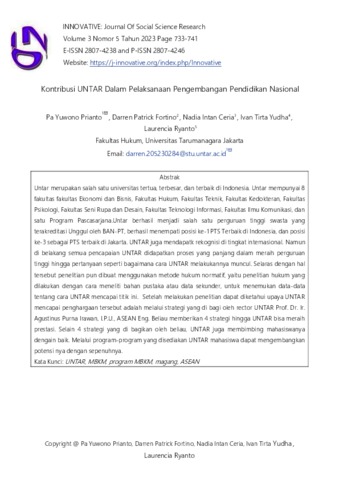 Prianto, Yuwono and Fortino, Darren Patrick and Ceria, Nadia Intan and Yudha, Ivan Tirta and Ryanto, Laurencia (2023) Kontribusi UNTAR Dalam Pelaksanaan Pengembangan Pendidikan Nasional. INNOVATIVE: Journal Of Social Science Research, 3 (5).