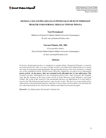 Permatasari, Yusi and Prianto, Yuwono KENDALA DALAM PELAKSANAAN PENEGAKAN HUKUM TERHADAP PRAKTIK PARANORMAL SEBAGAI TINDAK PIDANA. Jurnal Hukum Adigama.