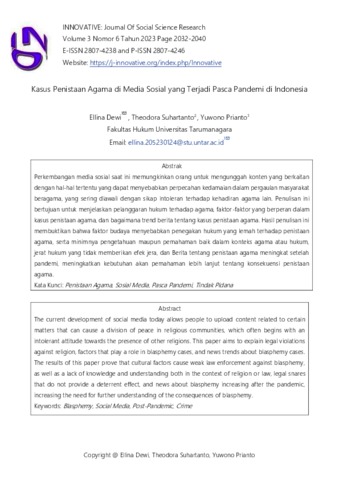 Dewi, Ellina and Suhartanto, Theodora (2023) Kasus Penistaan Agama di Media Sosial yang Terjadi Pasca Pandemi di Indonesia. INNOVATIVE: Journal Of Social Science Research, 3 (6).