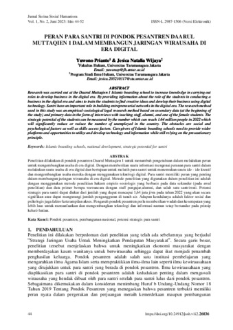 Prianto, Yuwono and Wijaya, Jesica Natalia (2023) PERAN PARA SANTRI DI PONDOK PESANTREN DAARUL MUTTAQIEN 1 DALAM MEMBANGUN JARINGAN WIRAUSAHA DI ERA DIGITAL. Jurnal Serina Sosial Humaniora, 1 (2).