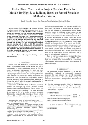 Basuki Anondho, Pertama and Ayomi Dita Rarasati, Kedua and Yusuf Latief, Ketiga and Khrisna Mochtar, Keempat Probabilistic Construction Project Duration Prediction Models for High Rise Building Based on Earned Schedule Method in Jakarta. Probabilistic Construction Project Duration Prediction Models for High Rise Building Based on Earned Schedule Method in Jakarta.