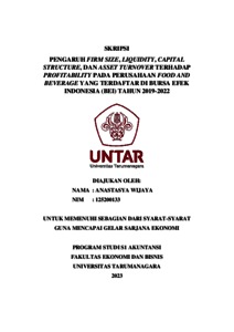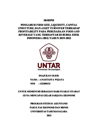 Wijaya, Anastsya (2023) PENGARUH FIRM SIZE, LIQUIDITY, CAPITAL STRUCTURE, DAN ASSET TURNOVER TERHADAP PROFITABILITY PADA PERUSAHAAN FOOD AND BEVERAGE YANG TERDAFTAR DI BURSA EFEK INDONESIA (BEI) TAHUN 2019-2022. Skripsi thesis, Fakultas Ekonomi dan Bisnis.