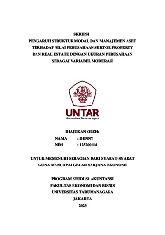 Denny, Denny (2023) PENGARUH STRUKTUR MODAL DAN MANAJEMEN ASET TERHADAP NILAI PERUSAHAAN SEKTOR PROPERTY DAN REAL ESTATE DENGAN UKURAN PERUSAHAAN SEBAGAI VARIABEL MODERASI. Skripsi thesis, Universitas Tarumanagara.