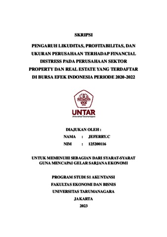 C, Jeferry (2023) PENGARUH LIKUDITAS, PROFITABILITAS, DAN UKURAN PERUSAHAAN TERHADAP FINANCIAL DISTRESS PADA PERUSAHAAN SEKTOR PROPERTY DAN REAL ESTATE YANG TERDAFTAR DI BURSA EFEK INDONESIA PERIODE 2020-2022. Skripsi thesis, Universitas Tarumanagara.