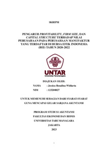 Widiarta, Jessica Rosalina (2023) PENGARUH PROFITABILITY, FIRM SIZE, DAN CAPITAL STRUCTURE TERHADAP NILAI PERUSAHAAN PADA PERUSAHAAN MANUFAKTUR YANG TERDAFTAR DI BURSA EFEK INDONESIA (BEI) TAHUN 2020-2022. Skripsi thesis, Universitas Tarumanagara.