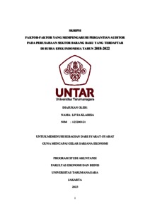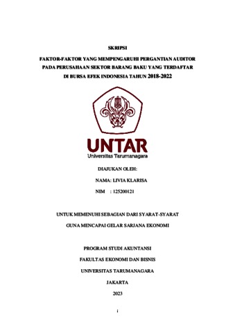 Klarisa, Livia (2023) FAKTOR-FAKTOR YANG MEMPENGARUHI PERGANTIAN AUDITOR PADA PERUSAHAAN SEKTOR BARANG BAKU YANG TERDAFTAR DI BURSA EFEK INDONESIA TAHUN 2018-2022. Skripsi thesis, Universitas Tarumanagara.