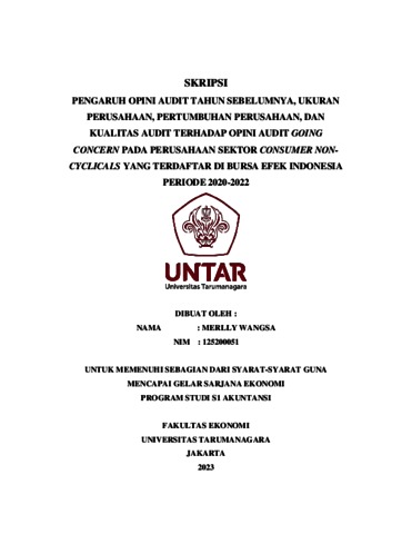 Wangsa, Merlly (2023) PENGARUH OPINI AUDIT TAHUN SEBELUMNYA, UKURAN PERUSAHAAN, PERTUMBUHAN PERUSAHAAN, DAN KUALITAS AUDIT TERHADAP OPINI AUDIT GOING CONCERN PADA PERUSAHAAN SEKTOR CONSUMER NON- CYCLICALS YANG TERDAFTAR DI BURSA EFEK INDONESIA PERIODE 2020-2022. Skripsi thesis, Universitas Tarumanagara.