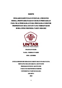 Wahid, Norman (2023) PENGARUH KEPUTUSAN INVESTASI , STRUKTUR MODAL, PROFITABILITAS,DAN UKURAN PERUSAHAAN PADA NILAI PERUSAHAAN PADA PERUSAHAAN SEKTOR PROPERTI DAN REAL ESTATE YANG TERDAFTAR DI BURSA EFEK INDONESIA TAHUN 2020-2022. Skripsi thesis, Universitas Tarumanagara.