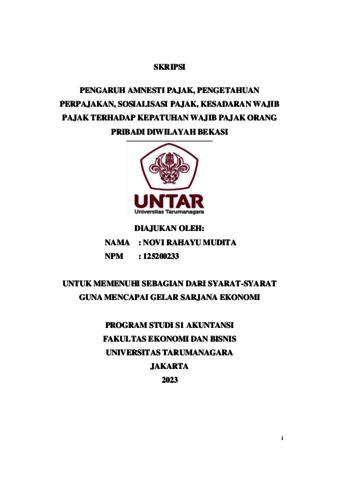 Mudita, Novi Rahayu (2023) PENGARUH AMNESTI PAJAK, PENGETAHUAN PERPAJAKAN, SOSIALISASI PAJAK, KESADARAN WAJIB PAJAK TERHADAP KEPATUHAN WAJIB PAJAK ORANG PRIBADI DIWILAYAH BEKASI. Skripsi thesis, Universitas Tarumanagara.