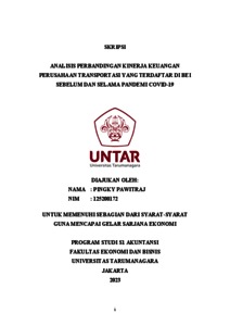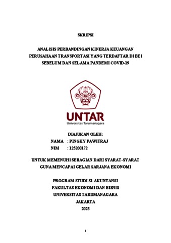 Pawitraj, Pingky (2023) ANALISIS PERBANDINGAN KINERJA KEUANGAN PERUSAHAAN TRANSPORTASI YANG TERDAFTAR DI BEI SEBELUM DAN SELAMA PANDEMI COVID-19. Skripsi thesis, Universitas Tarumanagara.