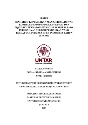 Setiadi, Regina Angel (2023) PENGARUH KEPEMILIKAN MANAJERIAL, DEWAN KOMISARIS INDEPENDEN, LEVERAGE, DAN LIQUIDITY TERHADAP FINANCIAL DISTRESS PADA PERUSAHAAN SEKTOR PERBANKAN YANG TERDAFTAR DI BURSA EFEK INDONESIA TAHUN 2020-2022. Skripsi thesis, Universitas Tarumanagara.