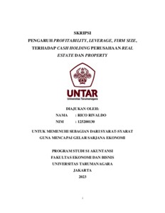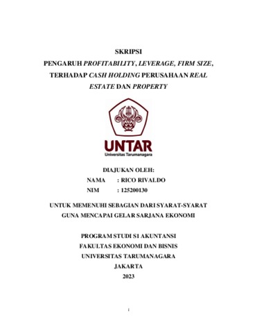 Rivaldo, Rico (2023) PENGARUH PROFITABILITY, LEVERAGE, FIRM SIZE, TERHADAP CASH HOLDING PERUSAHAAN REAL ESTATE DAN PROPERTY. Skripsi thesis, Universitas Tarumanagara.