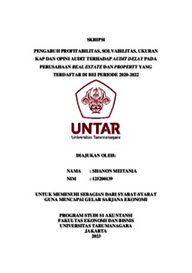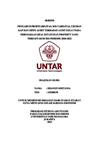 Meitana, Shanon (2023) PENGARUH PROFITABILITAS, SOLVABILITAS, UKURAN KAP DAN OPINI AUDIT TERHADAP AUDIT DELAY PADA PERUSAHAAN REAL ESTATE DAN PROPERTY YANG TERDAFTAR DI BEI PERIODE 2020-2022. Skripsi thesis, Universitas Tarumanagara.