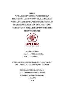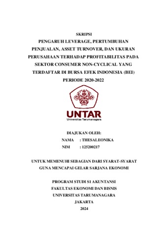 Thesaleonika, Thesaleonika (2023) PENGARUH LEVERAGE, PERTUMBUHAN PENJUALAN, ASSET TURNOVER, DAN UKURAN PERUSAHAAN TERHADAP PROFITABILITAS PADA SEKTOR CONSUMER NON-CYCLICAL YANG TERDAFTAR DI BURSA EFEK INDONESIA (BEI) PERIODE 2020-2022. Skripsi thesis, Universitas Tarumanagara.