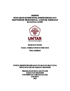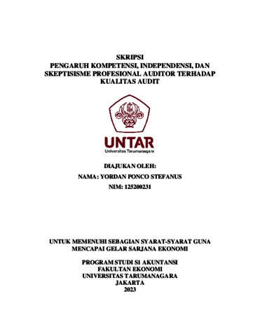 Stefanus, Yordan Ponco (2023) PENGARUH KOMPETENSI, INDEPENDENSI, DAN SKEPTISISME PROFESIONAL AUDITOR TERHADAP KUALITAS AUDIT. Skripsi thesis, Universitas Tarumanagara.