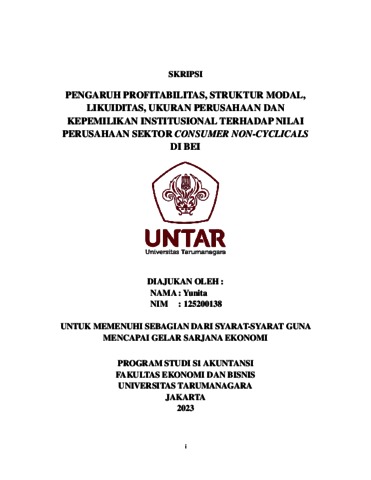 Yunita, Yunita (2023) PENGARUH PROFITABILITAS, STRUKTUR MODAL, LIKUIDITAS, UKURAN PERUSAHAAN DAN KEPEMILIKAN INSTITUSIONAL TERHADAP NILAI PERUSAHAAN SEKTOR CONSUMER NON-CYCLICALS DI BEI. Skripsi thesis, Universitas Tarumanagara.