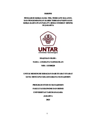 Nainggolan, Angelita (2023) PENGARUH KERJA SAMA TIM, WORK LIFE BALANCE, DAN PENGEMBANGAN KARIR TERHADAP KEPUASAN KERJA KARYAWAN PADA PT. RIMAU ENERGY MINING DI JAKARTA. Skripsi thesis, Universitas Tarumanagara.