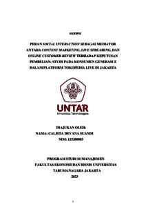 Suandi, Calista Devana (2023) PERAN SOCIAL INTERACTION SEBAGAI MEDIATOR ANTARA CONTENT MARKETING, LIVE STREAMING, DAN ONLINE CUSTOMER REVIEW TERHADAP KEPUTUSAN PEMBELIAN: STUDI PADA KONSUMEN GENERASI Z DALAM PLATFORM TOKOPEDIA LIVE DI JAKARTA. Skripsi thesis, Universitas Tarumanagara.