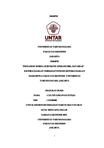 Suteja, Calvin Limawan (2023) PENGARUH NORMA SUBYEKTIF, EFIKASI DIRI, DAN SIKAP KEWIRAUSAHAAN TERHADAP INTENSI KEWIRAUSAHAAN MAHASISWA FAKULTAS EKONOMI UNIVERSITAS TARUMANAGARA JAKARTA. Skripsi thesis, Universitas Tarumanagara.