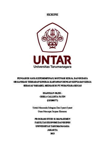 Fatin, Callista (2023) PENGARUH GAYA KEPEMIMPINAN, MOTIVASI KERJA, DAN BUDAYA ORGANISASI TERHADAP KINERJA KARYAWAN DENGAN KEPUASAN KERJA SEBAGAI VARIABEL MEDIASI DI PT NUSANTARA REGAS. Skripsi thesis, Universitas Tarumanagara.