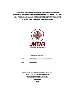 RANTUNG, DIESTRI MARGARET (2023) PENGARUH PENGUNGKAPAN MODAL INTELEKTUAL, ASIMETRI INFORMASI, DAN PROFITABILITAS TERHADAP MANAJEMEN LABA RIIL PADA PERUSAHAAN BARANG KONSUMEN PRIMER YANG TERDAFTAR DI BURSA EFEK INDONESIA TAHUN 2015 – 2019. Masters thesis, Universitas Tarumanagara.