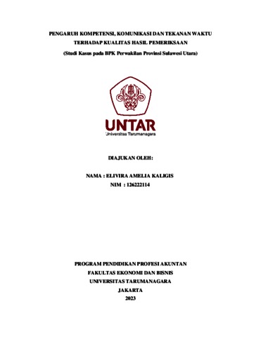KALIGIS, ELIVIRA AMELIA (2023) PENGARUH KOMPETENSI, KOMUNIKASI DAN TEKANAN WAKTU TERHADAP KUALITAS HASIL PEMERIKSAAN (Studi Kasus pada BPK Perwakilan Provinsi Sulawesi Utara). Masters thesis, Universitas Tarumanagara.