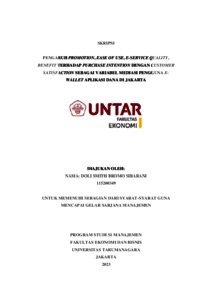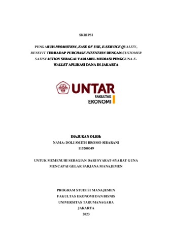 Sibarani, Doli Smith Bromo (2023) PENGARUH PROMOTION, EASE OF USE, E-SERVICE QUALITY, BENEFIT TERHADAP PURCHASE INTENTION DENGAN CUSTOMER SATISFACTION SEBAGAI VARIABEL MEDIASI PENGGUNA E- WALLET APLIKASI DANA DI JAKARTA. Skripsi thesis, Universitas Tarumanagara.