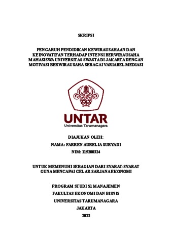 Suryadi, Farren Aurelia (2023) PENGARUH PENDIDIKAN KEWIRAUSAHAAN DAN KEINOVATIFAN TERHADAP INTENSI BERWIRAUSAHA MAHASISWA UNIVERSITAS SWASTA DI JAKARTA DENGAN MOTIVASI BERWIRAUSAHA SEBAGAI VARIABEL MEDIASI. Skripsi thesis, Universitas Tarumanagara.